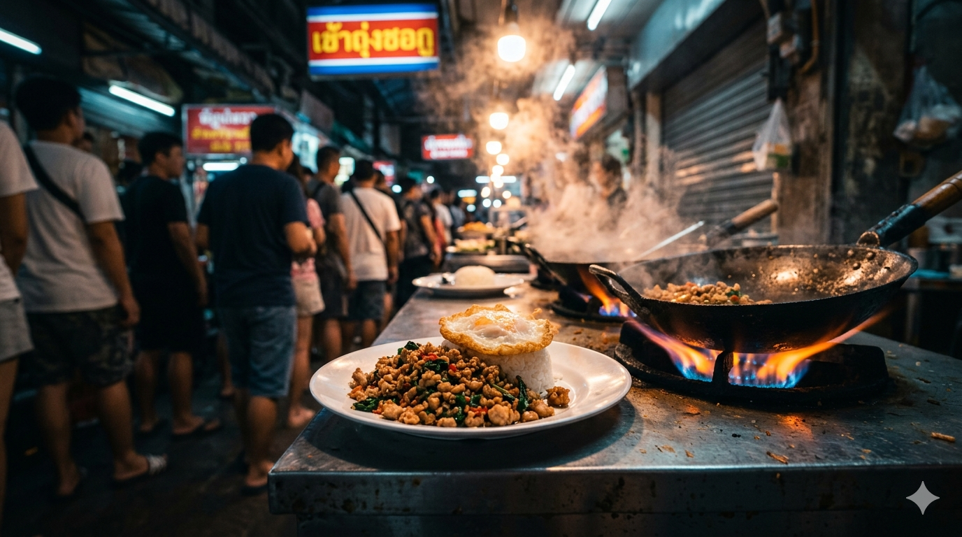Zodra je de scherpe, onweerstaanbare geur van sissende knoflook en chilipepers ruikt, weet je dat er een Pad Kra Pao in de maak is. Dit is het hart en de ziel van de Thaise streetfood cultuur, het gerecht dat locals blindelings bestellen voor een snelle, krachtige lunch. Het geheim zit hem in de Holy Basil (heilig basilicum), die pas op het allerlaatste moment in de gloeiend hete wok wordt geworpen en een unieke, peperachtige diepte aan het malse gehakt geeft.