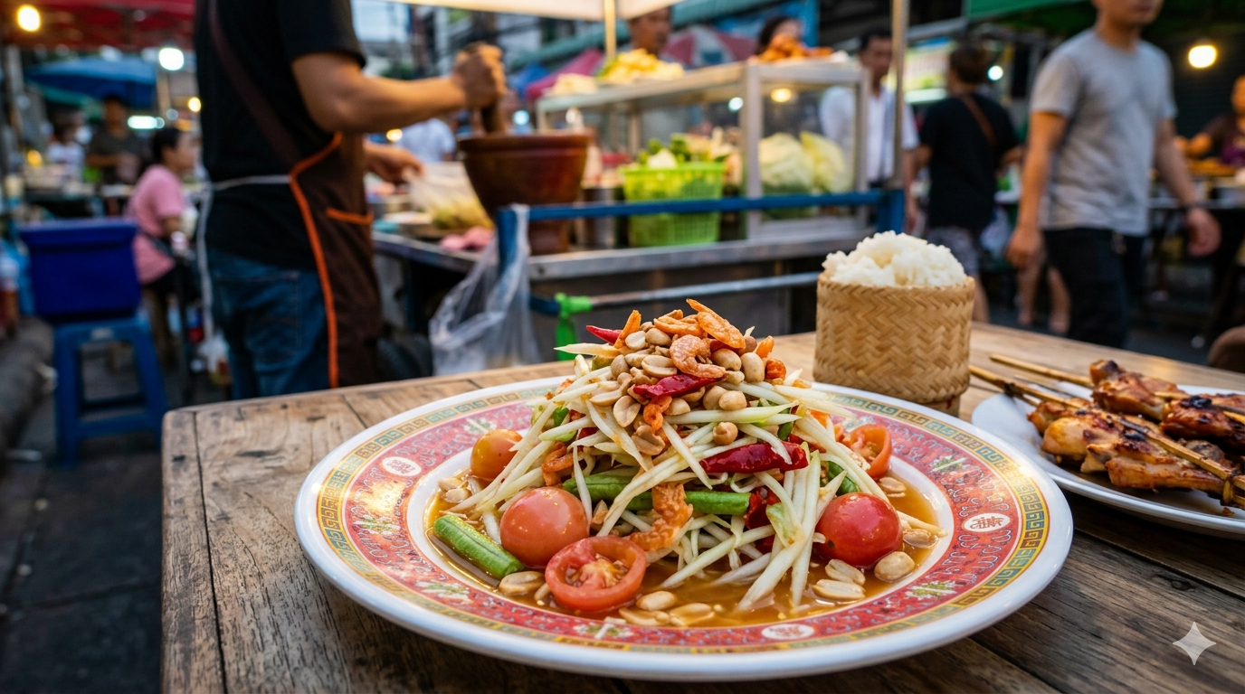 Wie Thailand zegt, zegt Som Tum. Deze pittige papajasalade is het hart van de Isaan-keuken en een absolute favoriet bij de lokale bevolking. Terwijl je bij het kraampje staat, hoor je het ritmische gestamp van de houten vijzel waarin verse knoflook, chilipepers, limoensap en vissaus worden vermengd met knapperige slierten onrijpe papaja.
