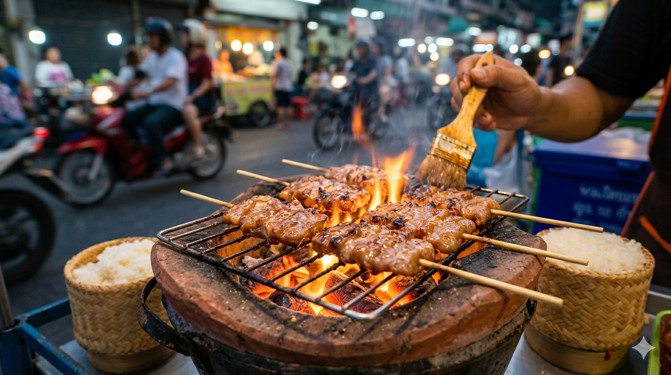 Je ruikt een kraampje met Moo Ping vaak al voordat je het ziet. De zoete, rokerige geur van gegrild varkensvlees op houtskool is onweerstaanbaar. Deze spiesjes worden urenlang gemarineerd in een mengsel van kokosmelk, knoflook en palmsuiker, wat ze hun kenmerkende glans en malse textuur geeft.